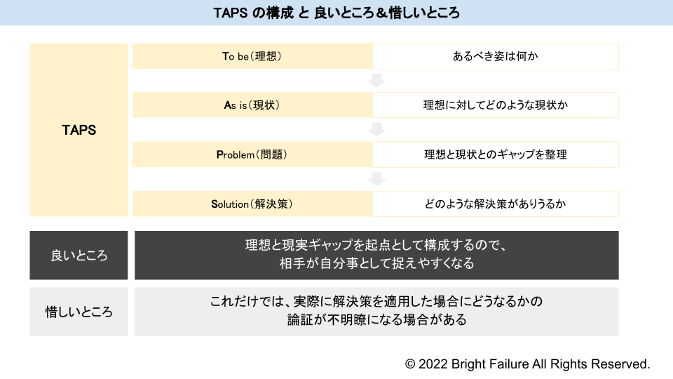 TAPSは、理想と現状のギャップを可視化して、解決策の必然性を高める提案型の構成です。