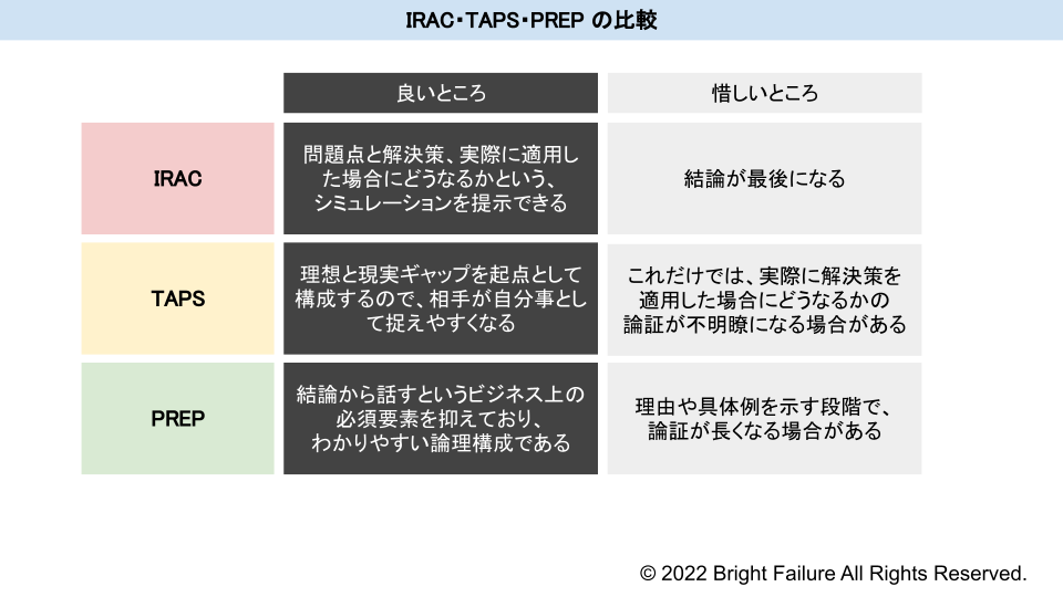 - 社内報告ならPREP、改善提案ならTAPS、分析レポートや稟議ならIRACが基本の目安です。