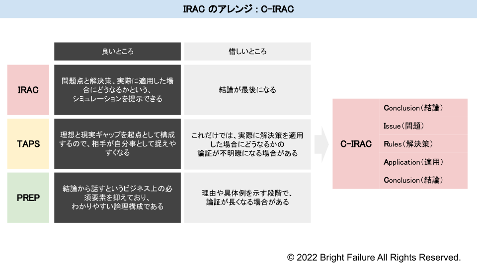 ビジネスでは結論先出しが好まれるため、C-IRAC(Conclusion→IRAC)も有効です。