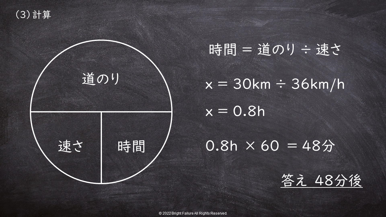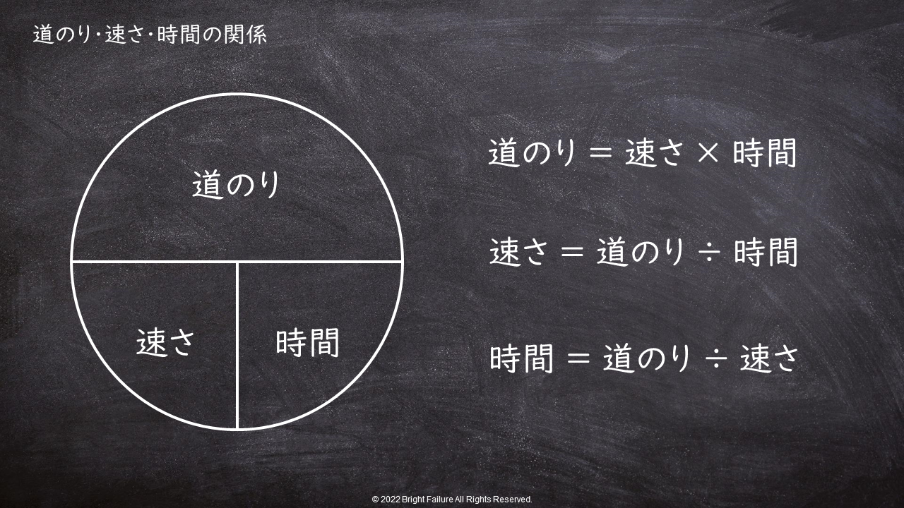 「時間」を求める際の式は、道のり(距離)÷速さで求まりますから、道のり(距離)と速さを前述の条件から整理しましょう。